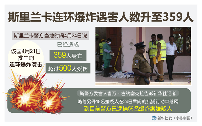 新華社科倫坡4月24日電(記者朱瑞卿 唐璐)斯里蘭卡警方24日說,該國21日發(fā)生的連環(huán)爆炸襲擊已經(jīng)造成359人身亡、超過500人受傷。