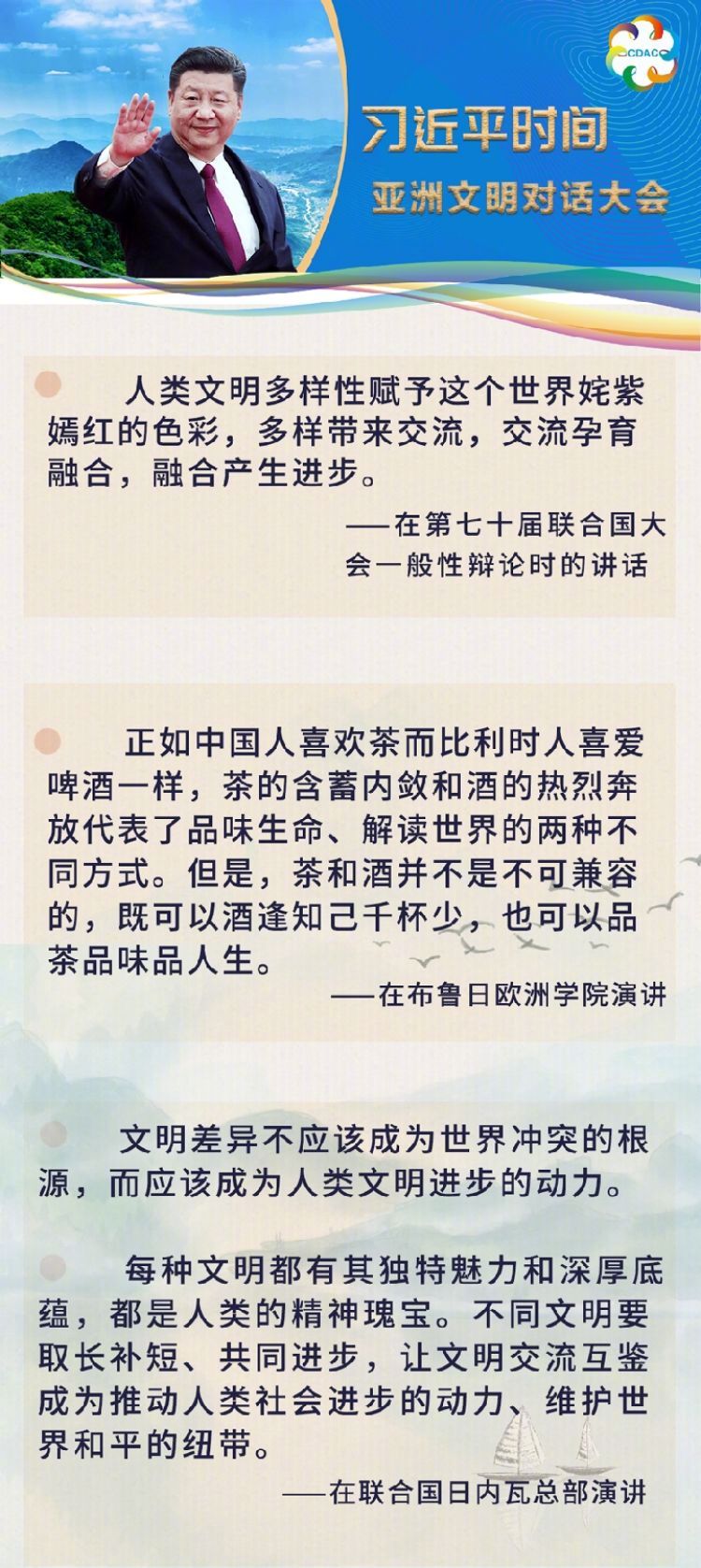 在這次演講中,習近平主席用生動的語言講明了對待不同文明應有的態(tài)度和原則: