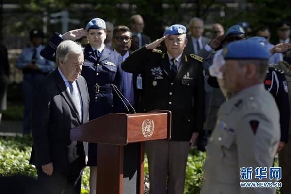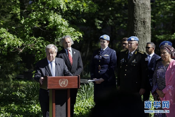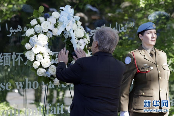 悼念活動(dòng)上午9時(shí)開始,聯(lián)合國秘書長古特雷斯向維和人員紀(jì)念碑敬獻(xiàn)花圈并致辭。