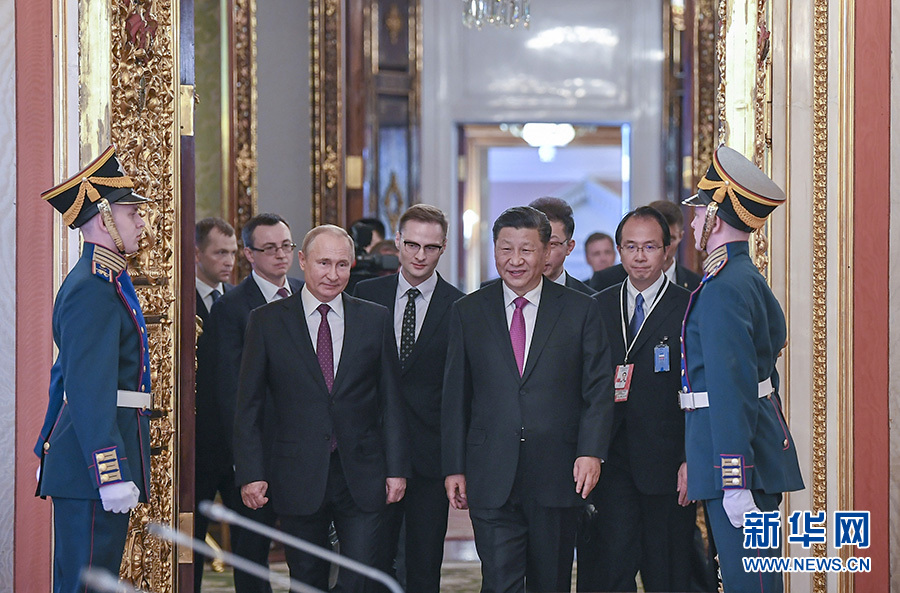 6月5日,國家主席習(xí)近平在莫斯科克里姆林宮同俄羅斯總統(tǒng)普京會(huì)談。這是兩國元首步入會(huì)場。 新華社記者 謝環(huán)馳 攝
