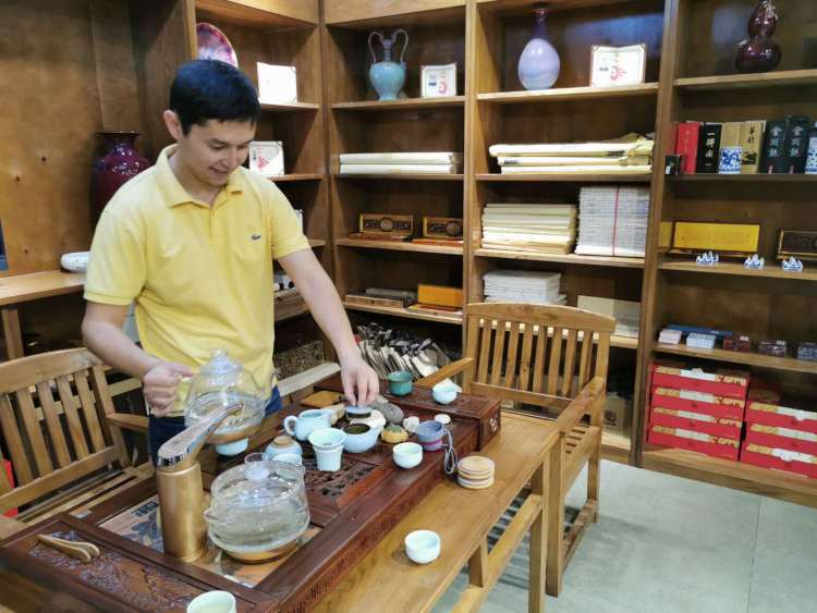 阿肯木還秀起了自己的功夫茶技,動(dòng)作有板有眼。(新華社記者 王申 攝)