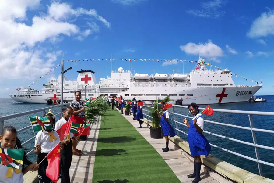 2018年10月12日,在多米尼克首都羅索,當(dāng)?shù)貙W(xué)生揮動多中兩國國旗歡迎中國海軍和平方舟醫(yī)院船首次到訪。新華社發(fā)