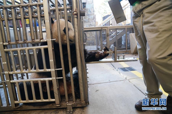 11月13日,在美國(guó)華盛頓的美國(guó)國(guó)家動(dòng)物園,大熊貓“貝貝”接受體檢后到室外活動(dòng)。新華社記者 劉杰 攝