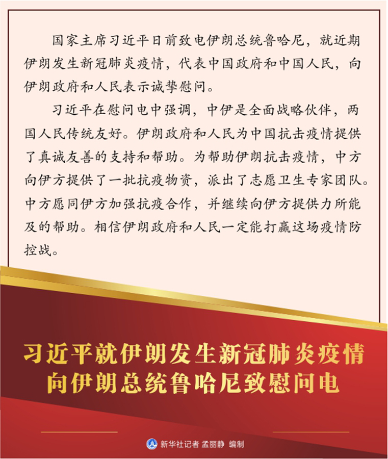 習(xí)近平在慰問電中強(qiáng)調(diào),中伊是全面戰(zhàn)略伙伴,兩國人民傳統(tǒng)友好。伊朗政府和人民為中國抗擊疫情提供了真誠友善的支持和幫助。為幫助伊朗抗擊疫情,中方向伊方提供了一批抗疫物資,派出了志愿衛(wèi)生專家團(tuán)隊(duì)。中方愿同伊方加強(qiáng)抗疫合作,并繼續(xù)向伊方提供力所能及的幫助。相信伊朗政府和人民一定能打贏這場疫情防控戰(zhàn)。