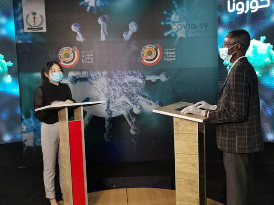 4月2日,中國(guó)第35批援蘇丹醫(yī)療隊(duì)隊(duì)員鄭喜在蘇丹國(guó)家新冠肺炎防控中心演播廳接受采訪(fǎng)并錄制視頻。(圖片由醫(yī)療隊(duì)提供)