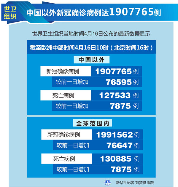 世衛(wèi)組織每日疫情報(bào)告顯示,截至歐洲中部時(shí)間16日10時(shí)(北京時(shí)間16時(shí)),中國以外新冠確診病例較前一日增加76595例,達(dá)到1907765例;中國以外死亡病例較前一日增加7875例,達(dá)到127533例。