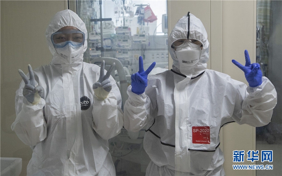 3月18日,在韓國大邱啟明大學(xué)東山醫(yī)院,醫(yī)護人員對記者擺出勝利手勢。新華社發(fā)(李相浩攝)
