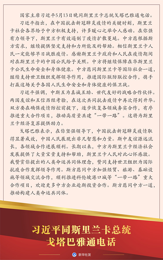 新華社北京5月13日電 國家主席習近平5月13日晚同斯里蘭卡總統(tǒng)戈塔巴雅通電話。