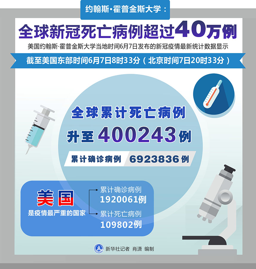根據(jù)該校的疫情數(shù)據(jù)統(tǒng)計(jì)系統(tǒng),截至美國東部時(shí)間7日8時(shí)33分(北京時(shí)間7日20時(shí)33分),全球累計(jì)死亡病例升至400243例,累計(jì)確診病例升至6923836例。