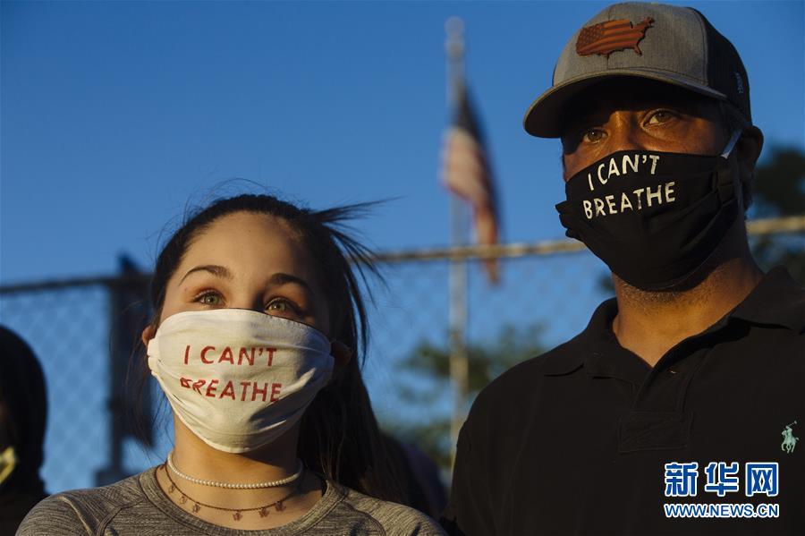 5月30日晚,在美國(guó)明尼蘇達(dá)州明尼阿波利斯市,抗議者面戴寫(xiě)有“我無(wú)法呼吸”的口罩,參加抗議活動(dòng)。新華社發(fā)(安格斯·亞歷山大攝)