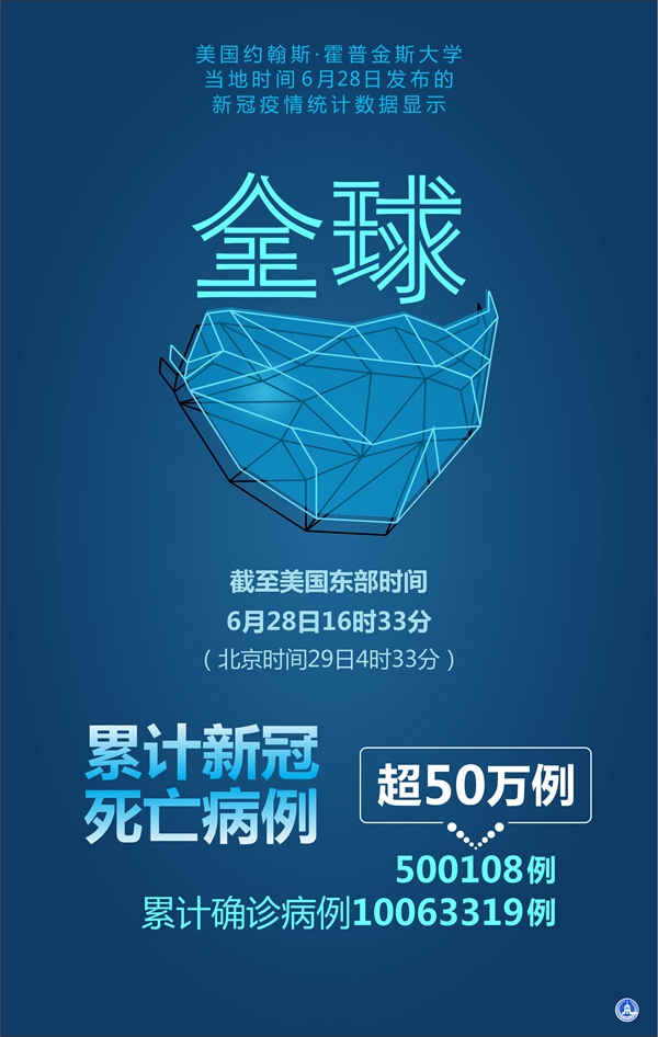 新華社北京6月29日電? 28日全球疫情簡(jiǎn)報(bào):美機(jī)構(gòu)統(tǒng)計(jì)全球累計(jì)新冠病例超1000萬(wàn) 死亡超50萬(wàn)