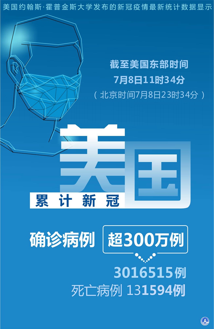 新華社紐約7月8日電 美國約翰斯·霍普金斯大學8日發(fā)布的新冠疫情最新統(tǒng)計數(shù)據顯示,美國累計確診病例超過300萬例。