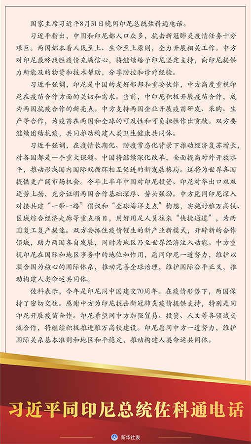 習(xí)近平指出,中國(guó)和印尼都人口眾多,抗擊新冠肺炎疫情任務(wù)十分艱巨。兩國(guó)都本著人民至上、生命至上原則,全力開(kāi)展相關(guān)工作。中方對(duì)印尼最終戰(zhàn)勝疫情充滿信心,將繼續(xù)給予印尼堅(jiān)定支持,向印尼提供力所能及的物資和技術(shù)幫助,分享防控和診療經(jīng)驗(yàn)。