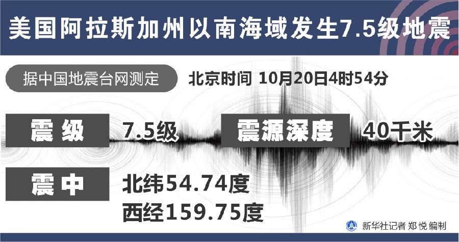 新華社快訊:中國地震臺網(wǎng)正式測定,10月20日4時54分在美國阿拉斯加州以南海域(北緯54.74度,西經(jīng)159.75度)發(fā)生7.5級地震,震源深度40千米。