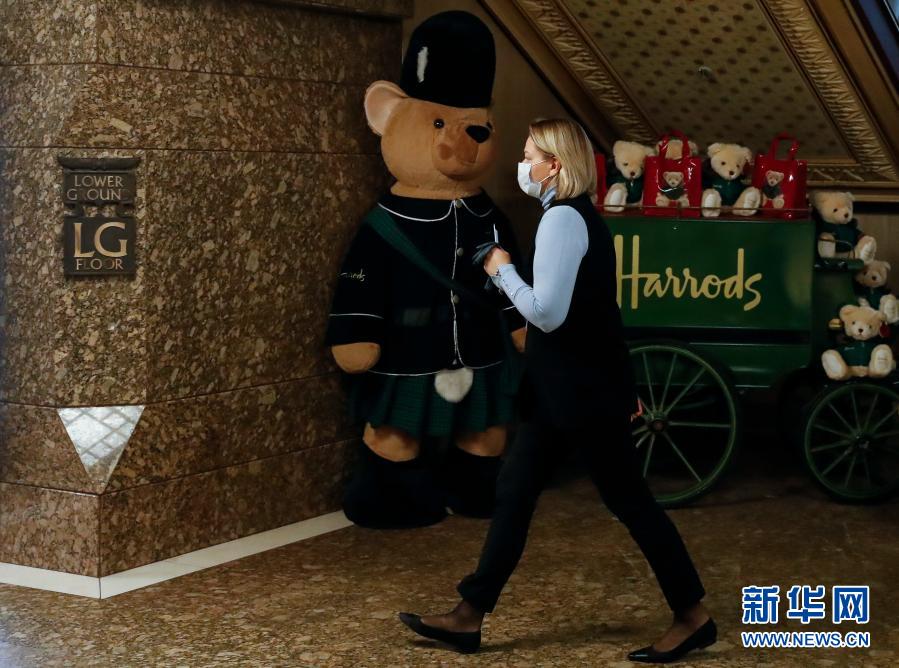 12月2日,一名戴口罩的女子走在英國(guó)倫敦重新開門營(yíng)業(yè)的哈羅德百貨商場(chǎng)內(nèi)。