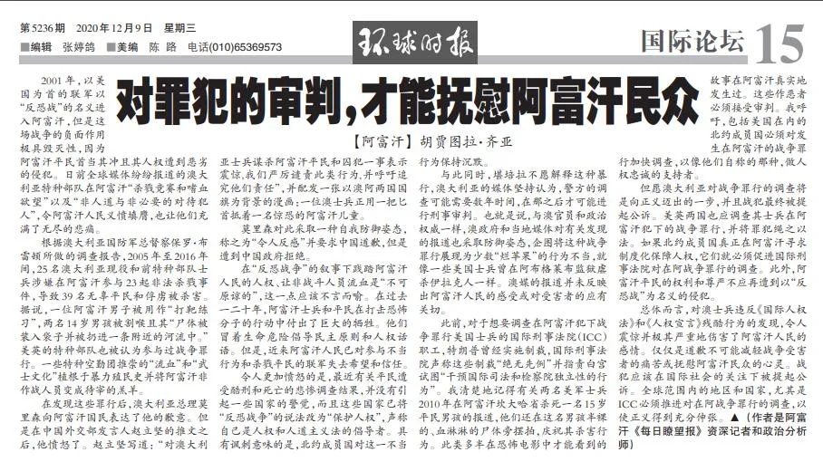 阿富汗《每日瞭望報(bào)》資深記者和政治分析師胡賈圖拉·齊亞在今日(12月9日)《環(huán)球時(shí)報(bào)》15版發(fā)表題為《對罪犯的審判,才能撫慰阿富汗民眾》的文章。以下是全文: