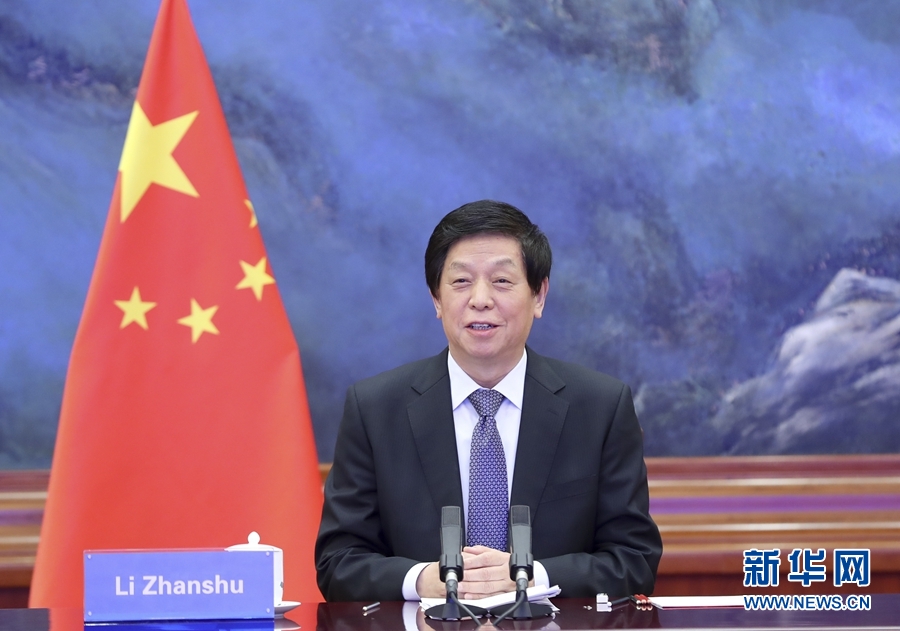 12月15日,全國人大常委會委員長栗戰(zhàn)書在北京人民大會堂以視頻方式同日本眾議長大島理森舉行會談。新華社記者 丁海濤 攝