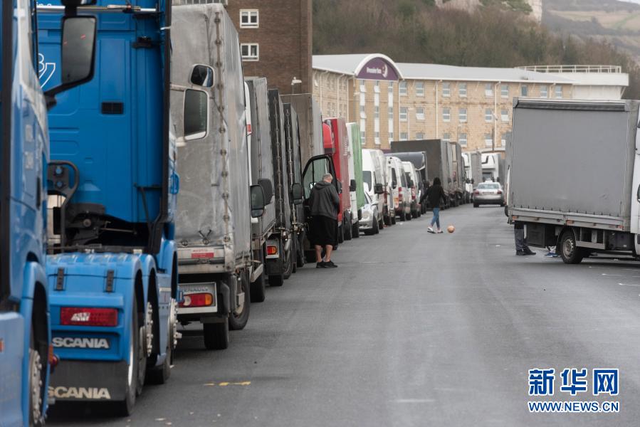 12月22日,在英國多佛,貨車因多佛港關閉在外排隊。新華社發(fā)(雷伊·唐攝)