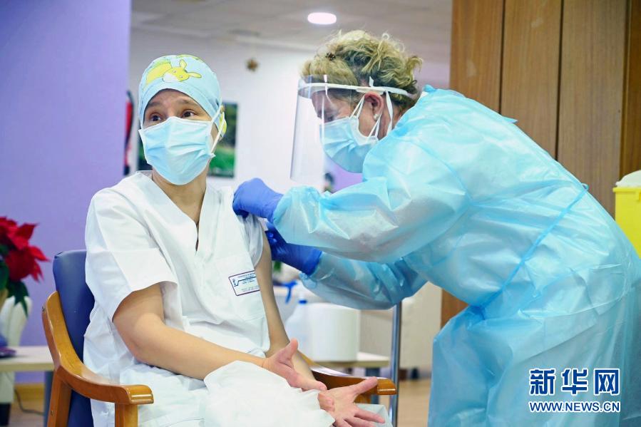 12月27日,護工莫妮卡·塔皮亞斯(左)在西班牙瓜達拉哈拉的洛斯奧爾莫斯養(yǎng)老院內(nèi)接受新冠疫苗注射。新華社發(fā)(西班牙首相府供圖)