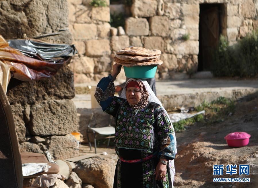 3月17日,70歲的卡茲蘭·阿布·卡巴什在約旦河西岸城市希伯倫附近的一個(gè)村莊運(yùn)送制作好的“塔本”烤餅。