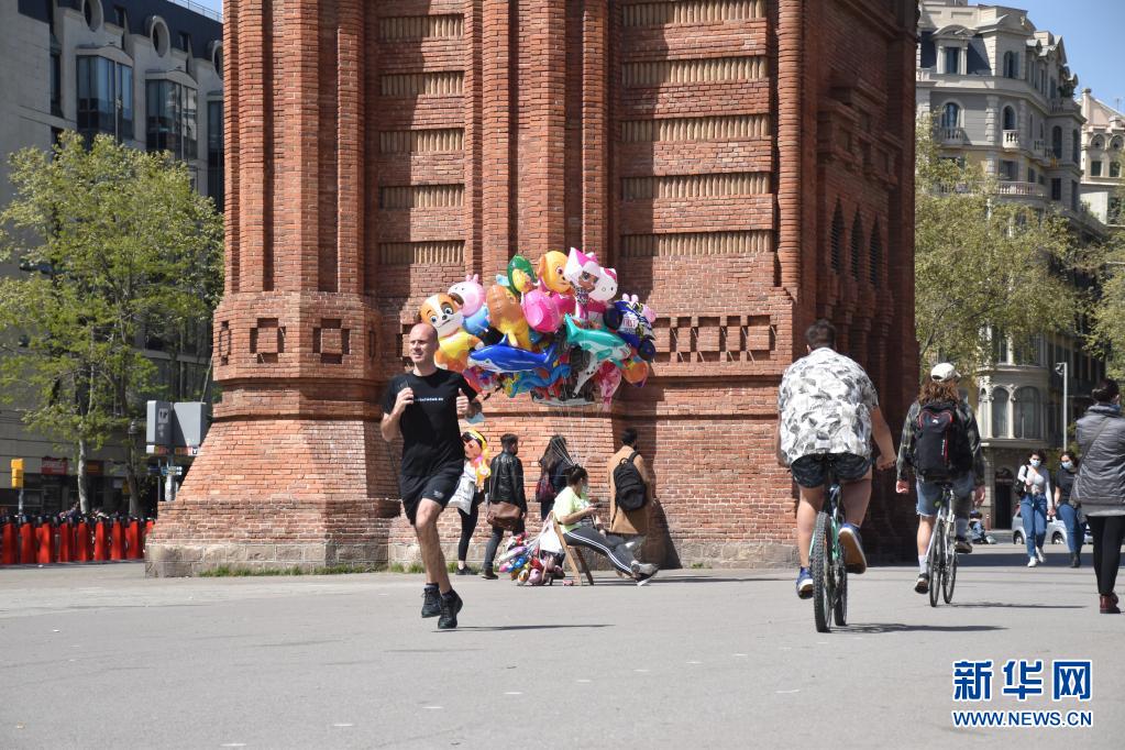 3月30日,一名男子在西班牙巴塞羅那凱旋門前鍛煉。