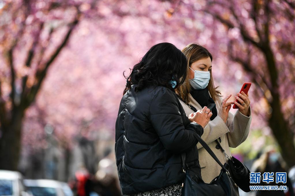 4月13日,兩名游人在德國波恩老城區(qū)用手機(jī)拍攝盛開的櫻花。