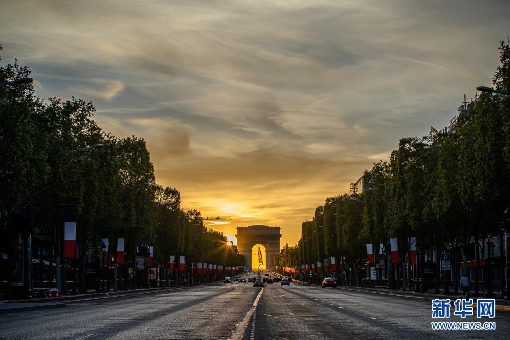 這是5月8日在法國(guó)巴黎香榭麗舍大街拍攝的凱旋門落日景象。