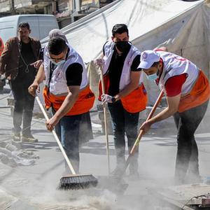 5月23日,巴勒斯坦志愿者在加沙城一處遭到以色列轟炸的地點(diǎn)清理廢墟。