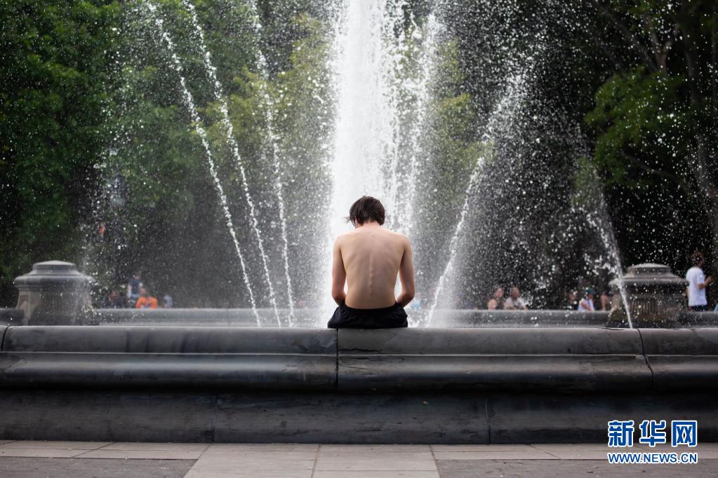 6月29日,在美國(guó)紐約一處公園,一名男子坐在噴泉邊納涼。