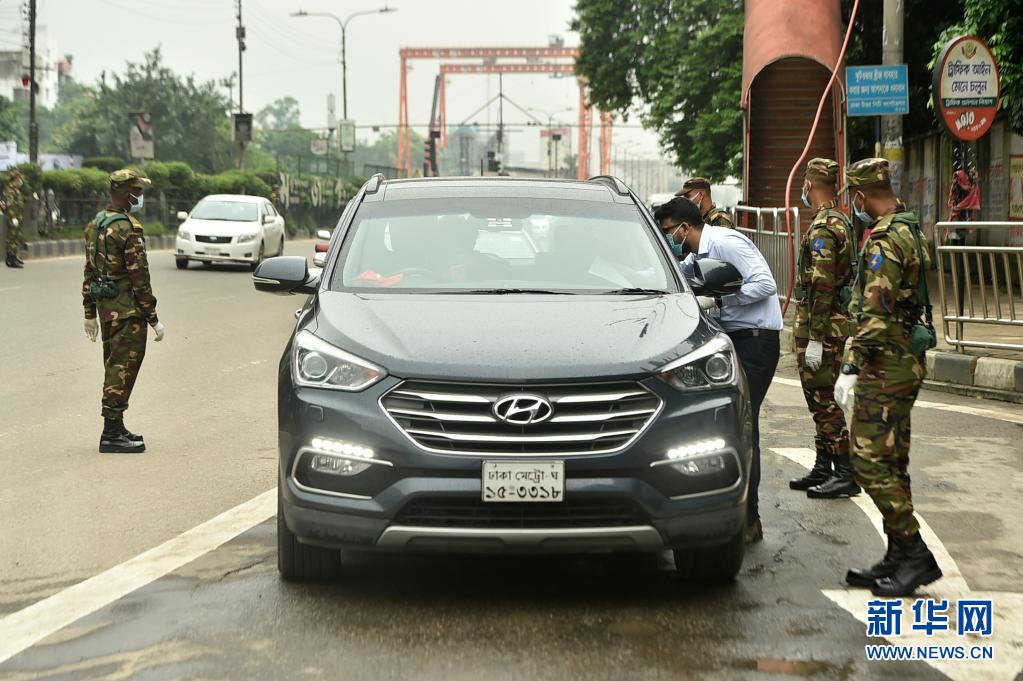 7月1日,軍人在孟加拉國達卡的街道上檢查過往車輛。